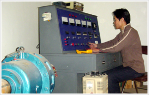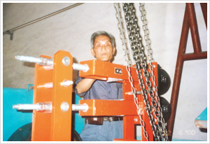 節(jié)能制動(dòng)器創(chuàng)始人張家政先生(左一)在北京起重運(yùn)輸機(jī)械研究所實(shí)驗(yàn)臺(tái)上進(jìn)行檢測(cè)